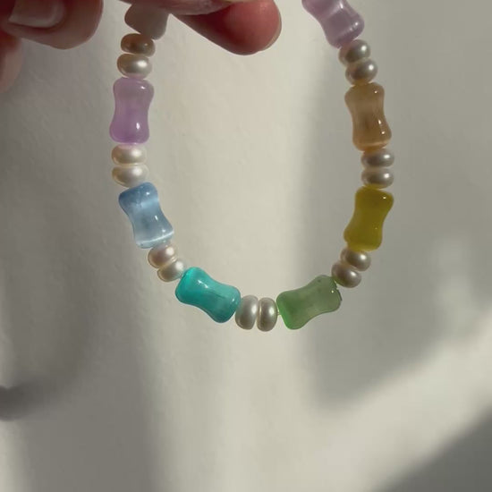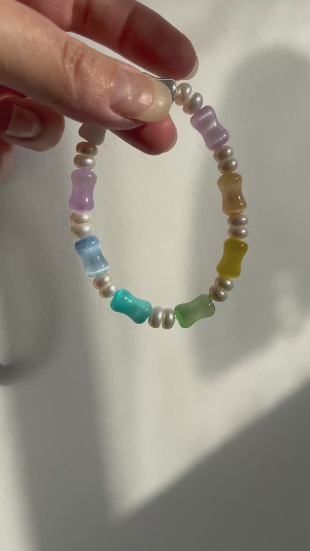 This stunning stretch bracelet features beautiul pastel coloured selenite stones which have an irridescent "cat eye" quality within the gemstones themselves. The selenite stones are interspersed with freshwater cultured pearls and finished with a silver plated accent bead.
