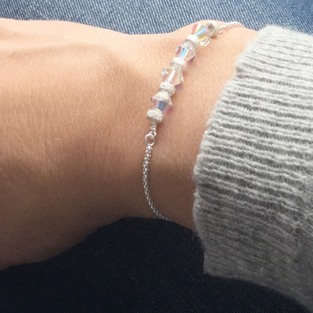 These beautiful sterling silver bracelets each contain a stunning gemstone said to be full of incredible properties. All of these bracelets (except for the rose quartz and white topaz bracelet which is not adjustable and will fit a standard 7 inch wrist) are fully adjustable to any size due to their clever slider mechanism. The focal point of the bracelet comes in various designs and one size fits all. Materials: sterling silver (925) with either Swarowski elements crystals, peridot, jadeite, rose quartz, amber, labradorite or black onyx.