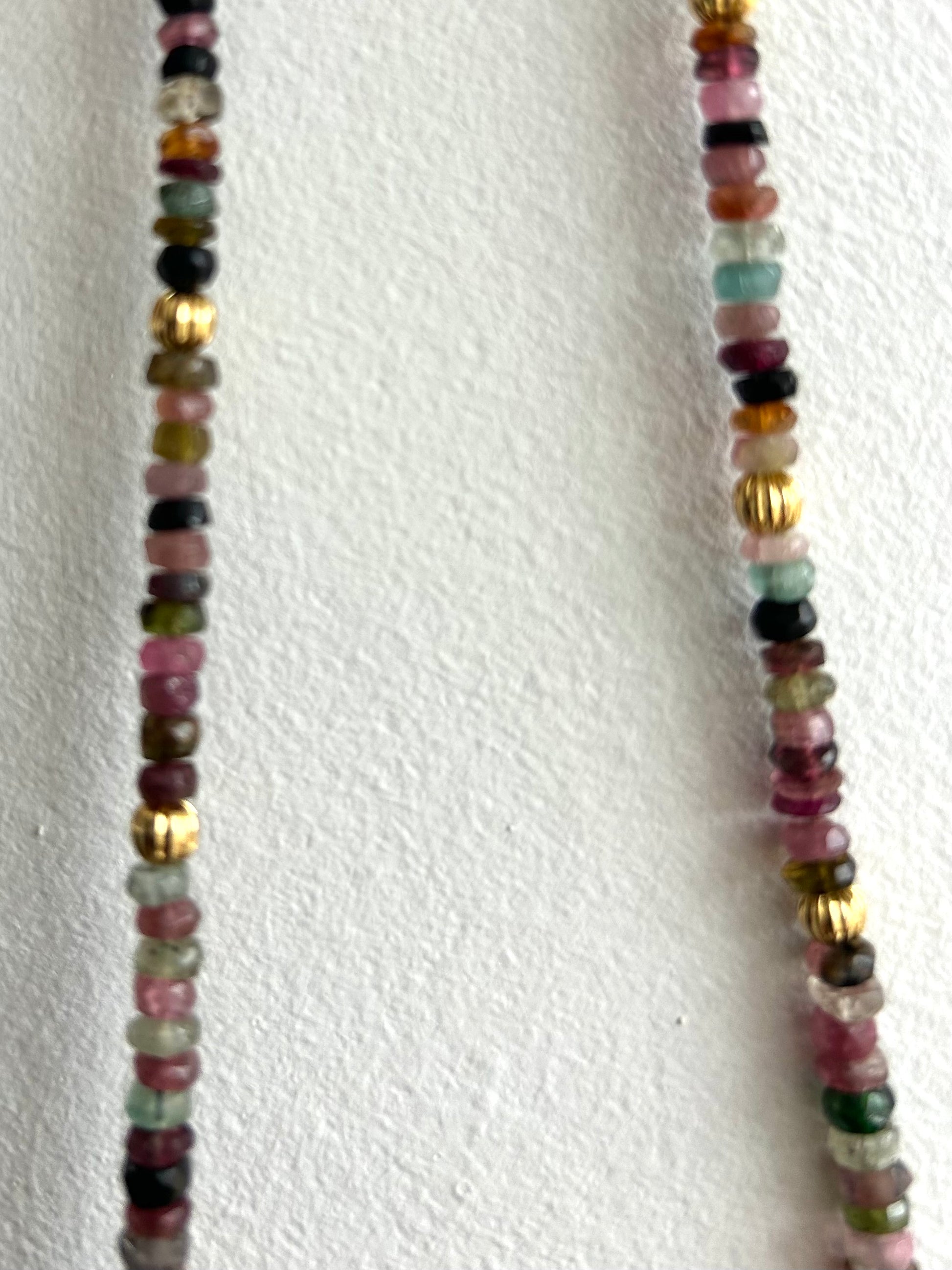 This stunning necklace is made from beautiful graduated rondelles of Tourmaline and gold plated accent beads with a gold plated clasp which can be worn at the front as a feature of the necklace.